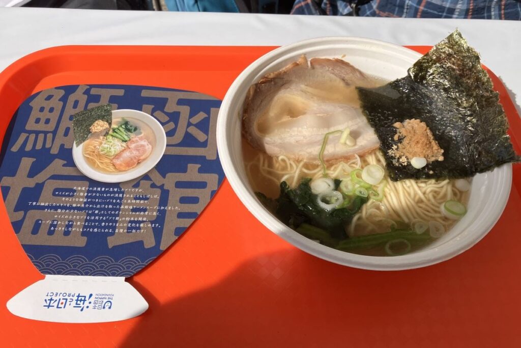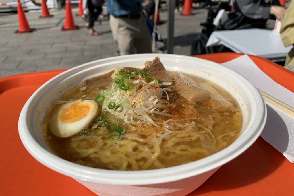 5丁目会場は「BAKU BAKU PARK」。道産小麦を使った「麦(ばく)」グルメを提供しています。「HOKKAIDOラーメン祭り2023inさっぽろ」と名付けたエリアでは、9月14日までの第1期、15日~21日の第2期、22日~30日の第3期に各5店が出店します。「札幌らーめん輝風すすきの店」は、札幌ラーメンの王道「元祖味噌」を提供。「函館朝市 地ブリショップ」は「函館ブリ塩ラーメン」を販売していました。各店とも、1杯800円です。