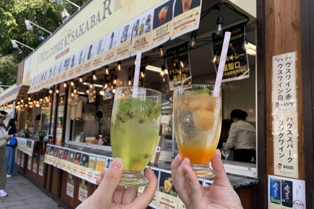 ビールや日本酒のほか、カクテルなども販売する「WELCOME SAKABAR」では、カラフルなフルーツを使ったドリンクもありました。生のフルーツを使った「キウイモヒート」と「メロンモヒート」(各750円)で乾杯です。