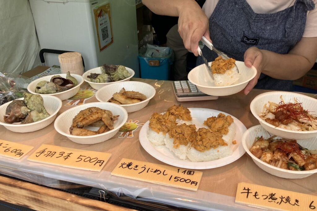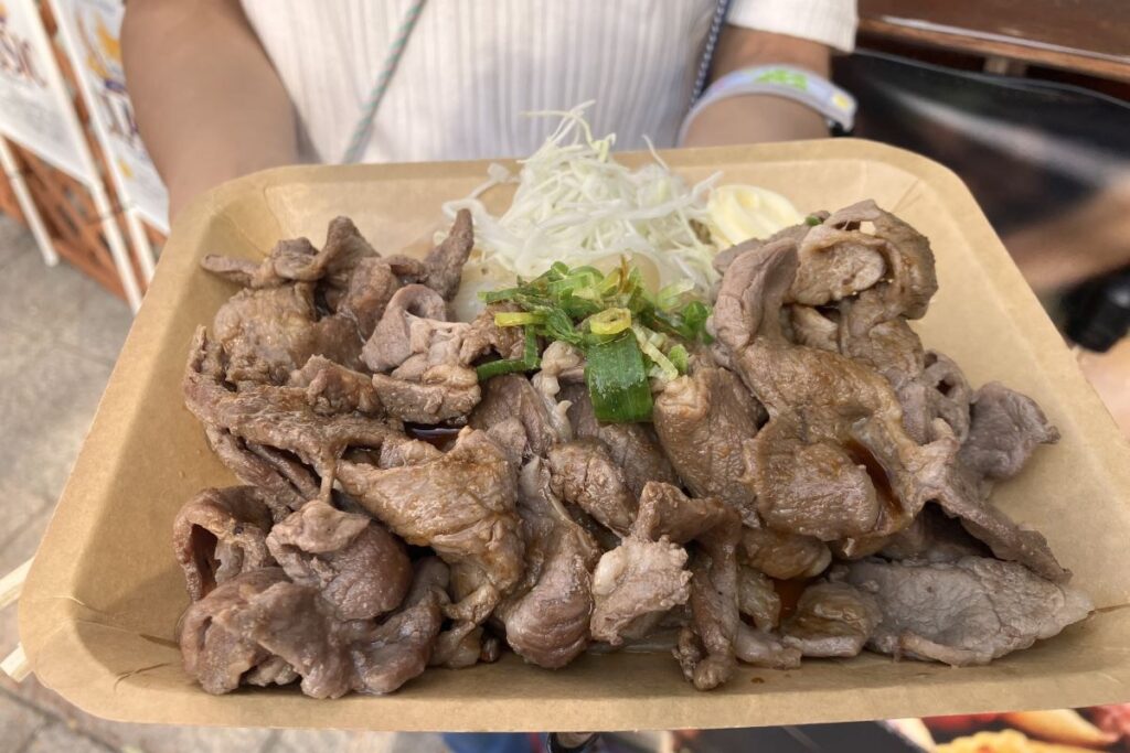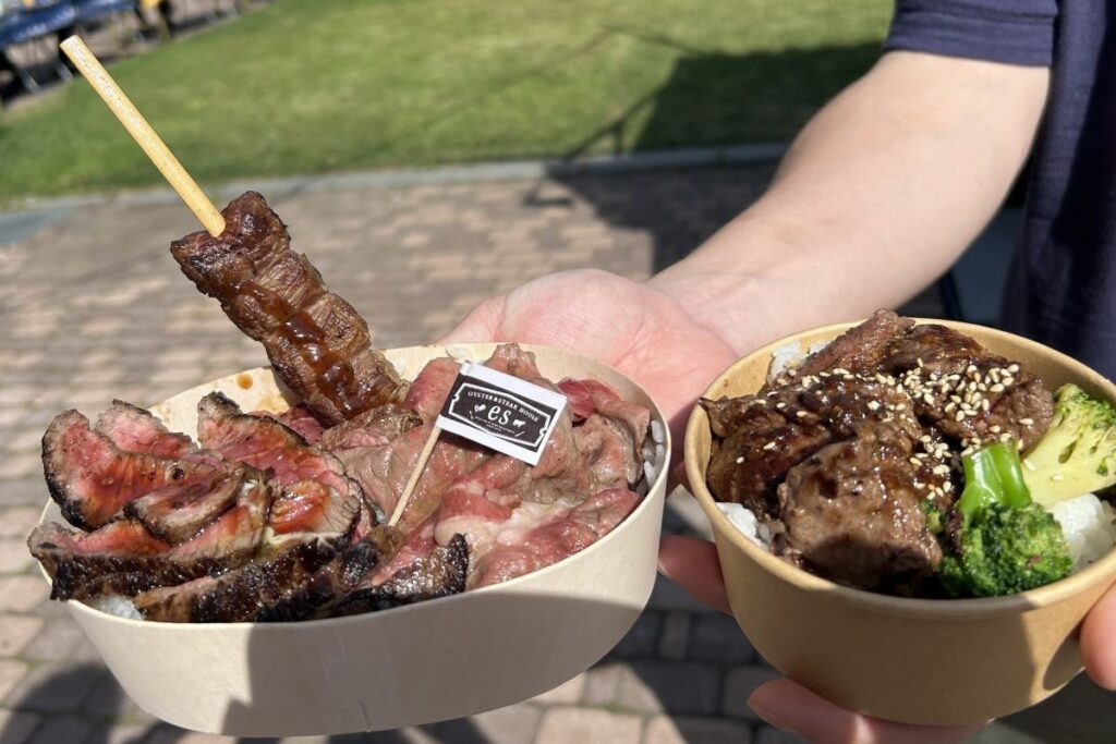10丁目会場は「産地とあなたをつなぐお肉じゅっ丁目」と題し、お肉料理の店がずらりと並びます。「Steak House es」の前で、何やら豪華なお肉のプレートを持った人がいました。豊西牛のランプステーキとカルビ串、帯広牛の焼きしゃぶがのった「肉・肉・肉まみれ ステーキ丼」(1900円)です。赤身とジューシーな肉を一度に味わえる豪華な一品です。もう一方は、「焼き肉みなほっ」の「中落ちカルビ丼」(800円)。木古内町で育てられたブランド牛「しんきん牛」を使っています。