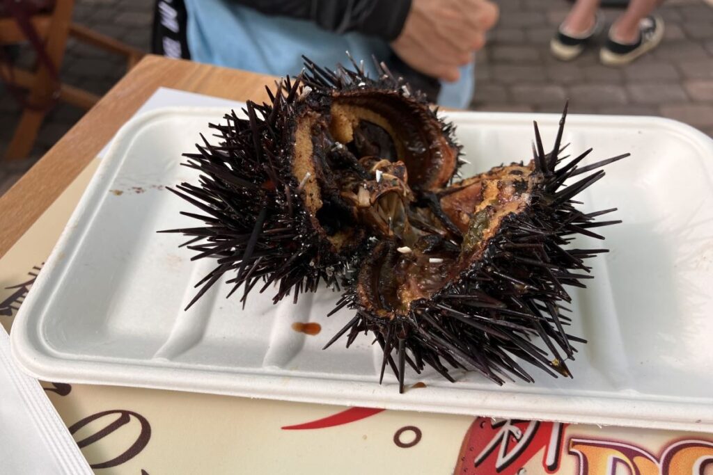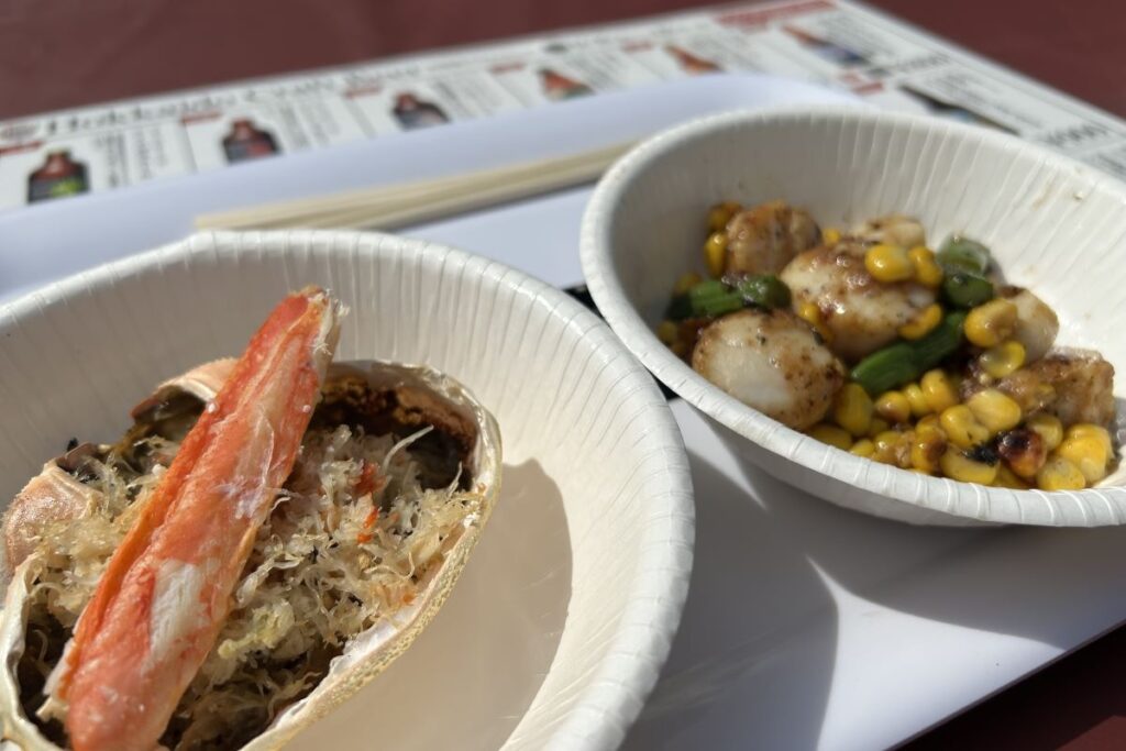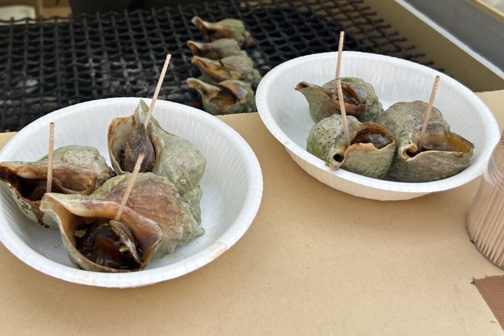 野外ステージのある6丁目会場は、「食と音楽 奏デリシャス!」として、食とともにジャズのライブも楽しめます。「島の人」では、利尻島と礼文島の食材を使ったフードを提供。ウニを殻ごと焼いた焼ウニやウニを乗せた殻付きの焼ホタテなど、ぜいたくな海の幸が人気でした。