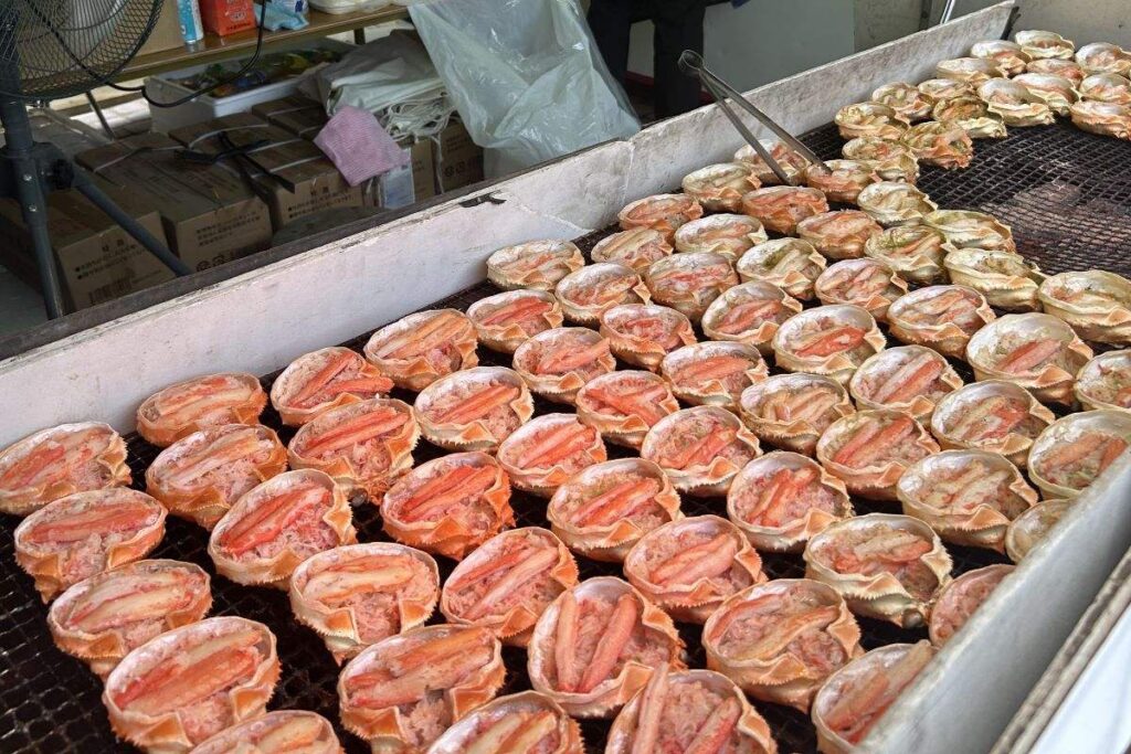 奥尻町のブースで、ぜいたくなご飯を発見。「焼きうにめし」(1500円)です。おにぎりの上に、これでもかとうにが山盛りになっています。紋別市のブースでは、炭火の上に、カニの甲羅焼き(1200円)がずらりと並び、次々と焼かれていました。容器にはベニズワイの殻を使っていますが、中身は本ズワイガニです。