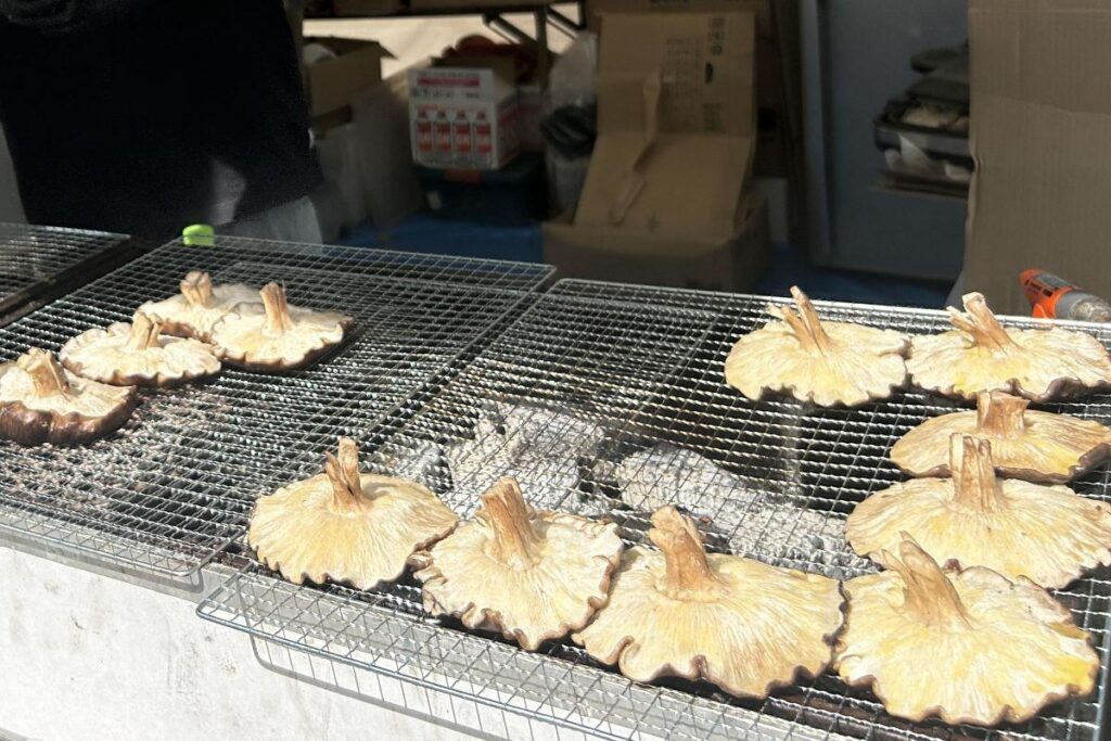 寿都町のブースでは、ツブの炭火焼き(500円)やタコの唐揚げ(500円)、ホッケフライ(700円)など、日本海の新鮮な海産物を販売。バターの香りに誘われて中標津町のブースに行くと、子どもの手のひらほどの大きなシイタケが炭火焼きされていました。「想いの茸(おもいのたけ)」と名付けた菌床シイタケで、バターしょうゆ焼きや山わさびしょうゆ焼き(各500円)やチーズをたっぷりのせたチーズ焼き(600円)などがありました。