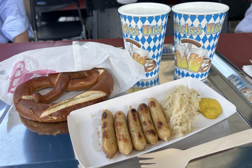 札幌市の姉妹都市、ドイツ・ミュンヘンのブース「ミュンヘングルメガーデン」もあります。アップルワインやドイツビール、ソーセージやプリッツェルなどドイツの本場の味を楽しめます。ドイツビールの「カーメリテン」のピルスとクロスターゴールド(各1100円)に、ソーセージの「ニュンベルガー」とザワークラウトの盛り合わせ(750円)、プレッツェル(600円)を合わせてみましょう。カーメリテンは10センチほどの小ぶりなソーセージ。からしを付けるとビールに良く合います。ザワークラウトは丸みを帯びた酸味がおいしい。プリッツェルは発酵バターを使っているそうで、バターの香りが強く、塩気もあるのでビールが進みます。