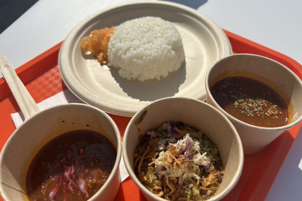 「札幌カリーキングダム2023」のエリアには、1日4店ずつ、期間中に計25店のカレー店が出店。初日は「スパイスと酒 Knot.(ナット)」「蕎麦さとやま」「西神珈竰本店」「エイトカリィ」が出店。カレーは3種セットで1600円、2種セットで1300円です。ひとつずつ食べ比べるのもよし、「あいがけ」にして各店のカレーを混ぜながら食べるのもよし。いろいろな店のカレーを混ぜて食べるなんて、普段はできない体験です。