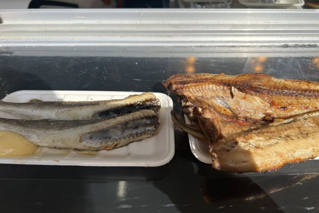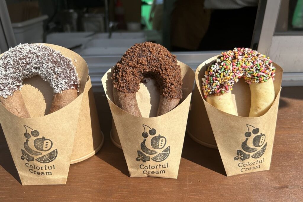 「祐一郎商店」は、新鮮な海産物の焼き物などを提供。脂ののったホッケのあぶり焼き(900円)やマヨネーズを添えた大きな氷下魚(こまい)のあぶり焼き(600円)を提供。「カラフルクリーム×RE di ROMA plus」は、ジェラートと並んで、リングスコーン(500円)が人気です。一般的な四角や丸い形でなく、ドーナツ状になっているのが特徴で、カップジェラートに刺したコラボメニューもあり、ジェラートで冷えた口をスコーンでリセットしながら食べるのも良さそうです。