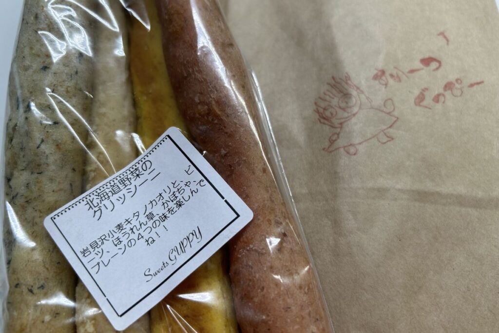 パンやスイーツのお店が日替わりで出店する「Daily Bread&sweets Market」には日替わりで3店が出店。この日出ていた「Sweets GUPPY」で、道産野菜のグリッシーニを買ってみました。岩見沢産の小麦「キタノカオリ」を使っており、プレーンのほかビーツとホウレンソウ、カボチャの4本入り。グリッシーニというと、プリッツェルのような固いものを思い浮かべますが、これはふっくらもちもち、小麦の香りと野菜の味が感じられます。