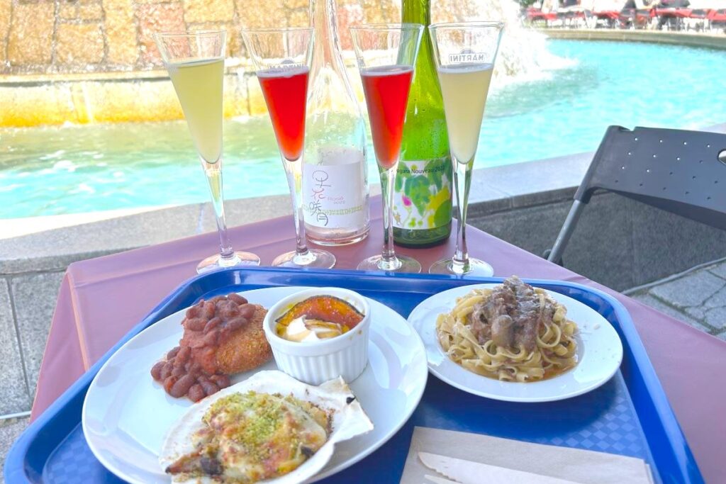 シェフズキッチンには、ワインもたくさん置いてありました。その中から、山田堂「ナイアガラスパークリングヌーヴォー2022」とランセッカ「早花咲月2021」、ドメーヌ・モンのシードル「モンシー2021」と余市産の3種類を、同行した4人がそれぞれ1杯ずつ、いただきました。