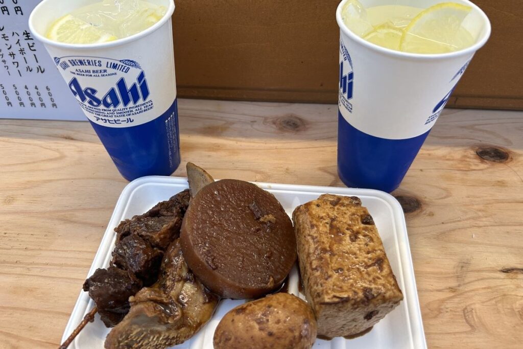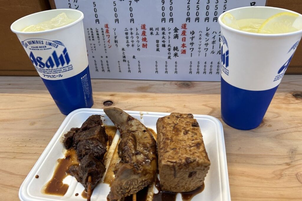 このお店は「レモンサワー×どて串」。レモンのスライスを浮かべたレモンサワー(400円)とどて3種盛り(900円)。この日は、十勝和牛すじ(350円)と当別産豚タン(350円)、江別産豆腐(250円)を盛り合わせてくれました。ほかにどて串は、留寿都産大根(300円)と道産玉子(250円)もあります。