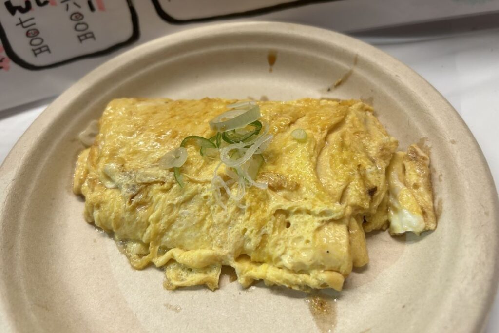 目の前の鉄板ではもつが焼かれています。卵を溶いて、そこにもつ煮のだしを入れて、鉄板にジュワー。こてで器用にまとめ、くるくる巻いてだし巻き玉子(600円)が完成しました。思わず、「こっちにもだし巻き玉子ください」とオーダーしてしまいました。隣の同僚も「もつ焼もお願いします」。