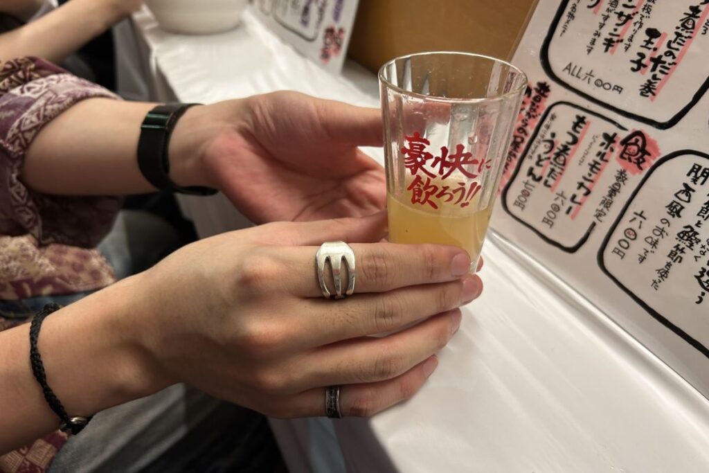 食べ物のメニューは餃子のほか、辛口白菜ラーメン(千円)としょうゆラーメン(800円)、しょうがラーメン(900円)のみ。同行してくれた同僚がしきりと、「しょうがラーメンいいなー」とつぶやきますが、まだ1店目。「4店回っておなかに余裕があったら来ましょう」と説得し、次のお店へ。