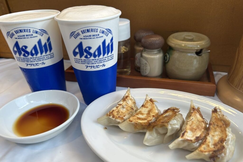 ここでは「ビール×餃子」を提案しているので、生ビール(600円)と焼餃子(500円)で乾杯です。きれいな焼き色の付いた小さめの餃子が5個。ビールをグビグビっと流し込み、餃子をこしょうをたっぷり入れた酢に付け、一口でぱくり。小さいながら、ぎゅっとお肉が詰まっていて、うまみがあります。細かく切ったキャベツが入っており、時々感じるコリコリとした歯触りが楽しい。酢じょうゆでも食べてみましたが、酢こしょうの方が合う気がします。