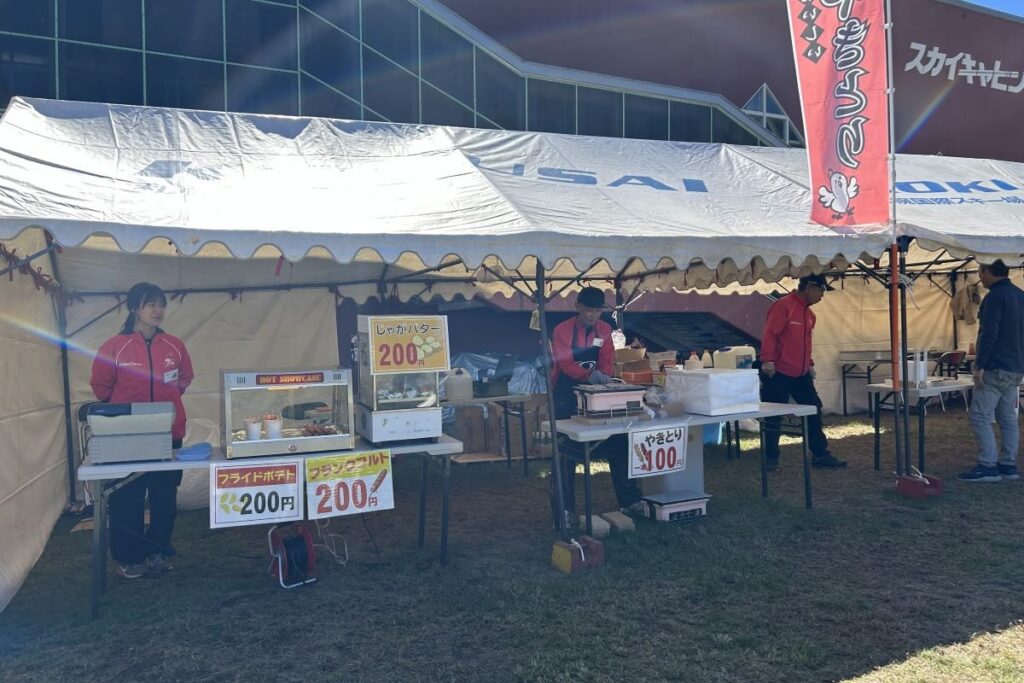 芝生にはテーブルやいすが用意され、フライドポテトやフランクフルト、じゃがバターなども販売されています。10月に入ると、週末や祝日にはたこ焼きやクレープ、焼きそばなどのキッチンカーや屋台が出店するほか、ジャガイモ詰め放題(200円)などのイベントもあります。