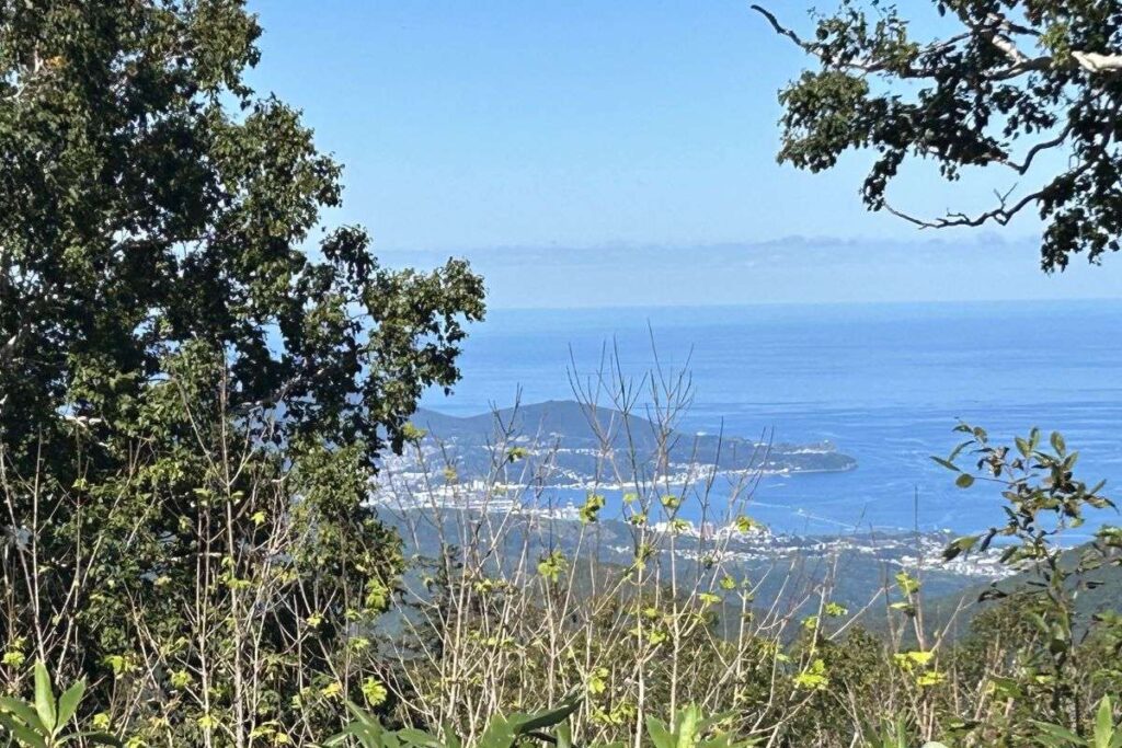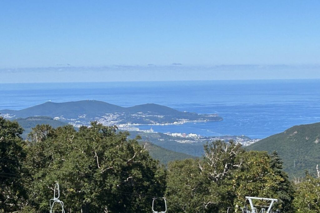 今度はよく見えます。紅葉するとオレンジや赤の木々と、青い海と空とのコントラストが映えそうです。このリフト降り場には屋根があって、日陰になっています。四方を撮影して数分いると寒くなってきました。さらに5分ほど下ったところにも、ビューポイントがあるそうです。看板には「行きは『ヨイヨイ』、帰りは『コワイ』」と書いてあり、眺めるとかなりの急勾配で、ちょっと帰り道を心配しましたが、せっかくなので行ってみます。