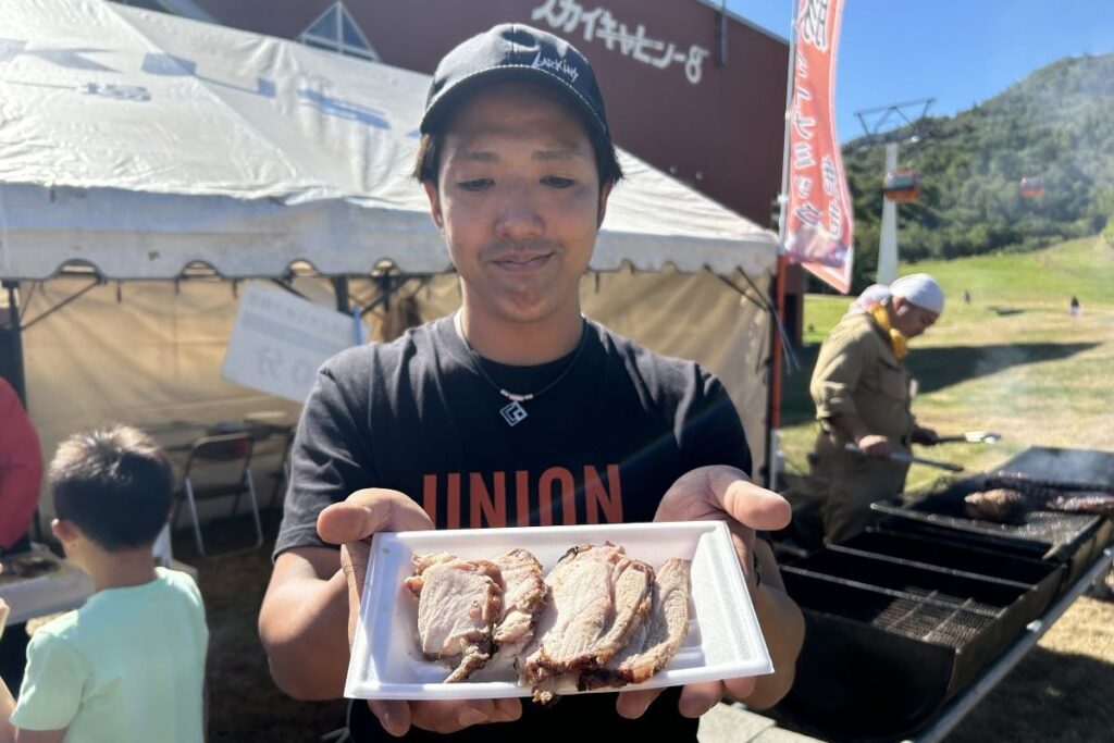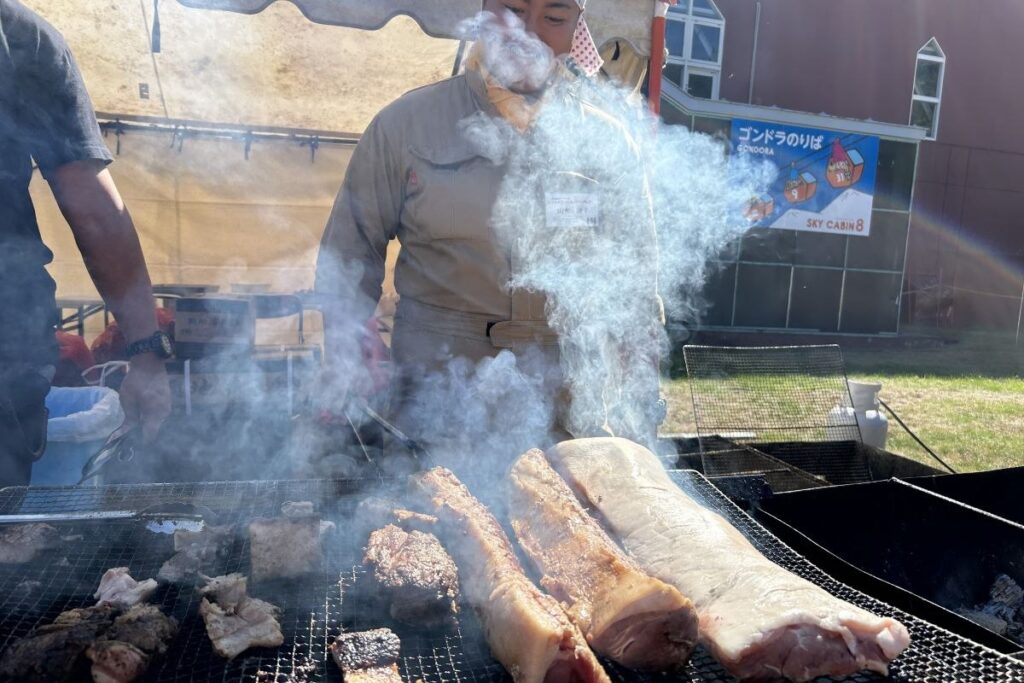 ゴンドラを下りると、何やらおいしそうな匂いが。国際スキー場の秋祭り名物の「ダイナミック焼き」を販売しています。1本3~4キロの道産豚ロースをまるごと、1.5~2時間かけて炭火で焼き上げます。