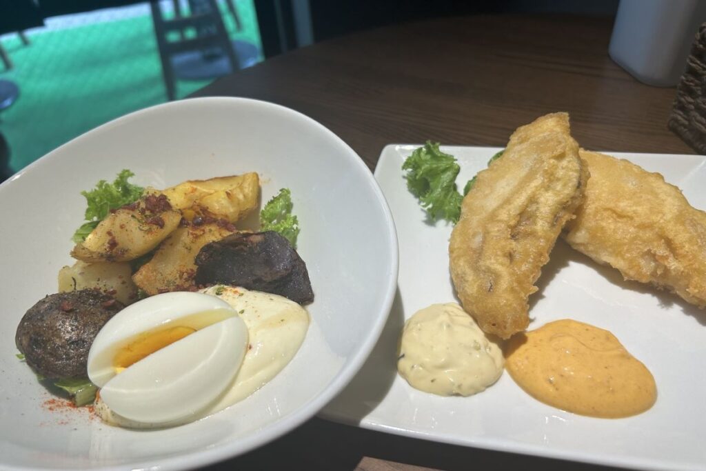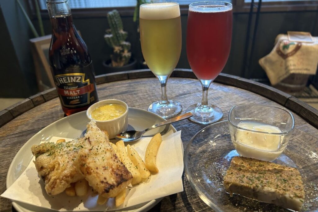 ヨーテイ3種の飲み比べセット(各150ミリリットル)とフィッシュ&クラフトポテサラをオーダーします。10センチを超える大ぶりなフリットが2切。タルタルソースとカレー風味のソースが添えられています。衣はカリカリ、タラの身はふっくら弾力があって、クリーミーなタルタルとぴったり。カレー風味のソースはぴりっとスパイシーで、飽きません。