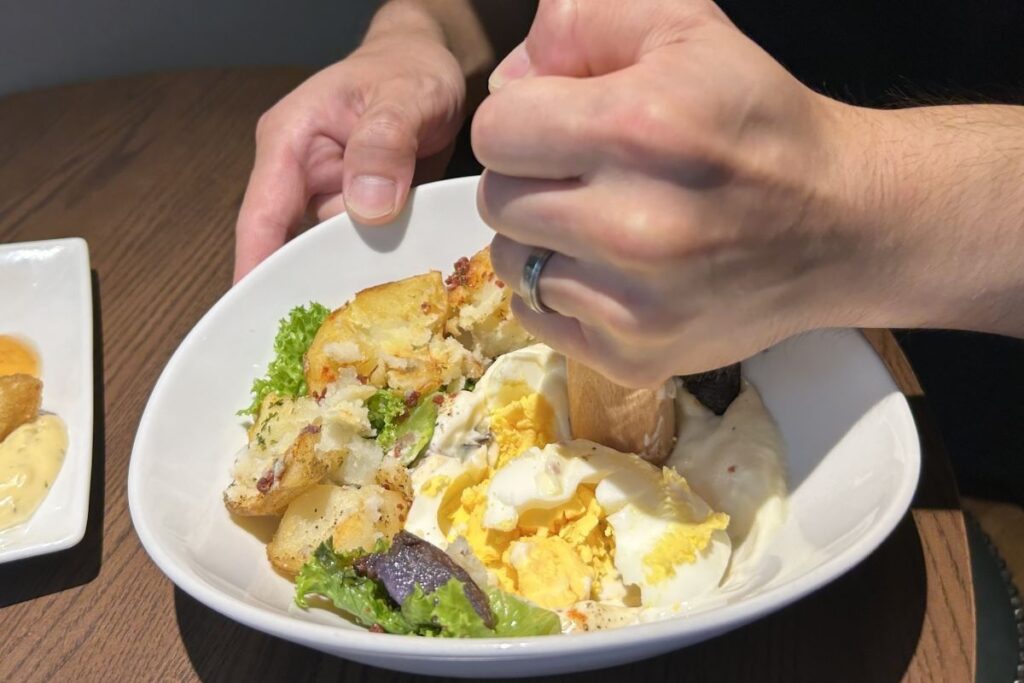 ポテサラは「クラフト」というだけあって、お客さんが自分でクラフト(手作り)する趣向。ジャガイモとマヨネーズ、ゆで卵をついてくるすりこぎで好みの加減につぶして混ぜ合わせます。ジャガイモは手でほぐして揚げてあるので、端の部分はカリッと、中はほっこり、ねっとり。高橋さんは「その食感を味わうためにも、ざっくりつぶすのがおすすめ」。一口ごとに口に入るジャガイモの種類やパーツが違い、フライドベーコンの塩気とサクサクの食感がいいアクセントになって楽しく食べ進めます。