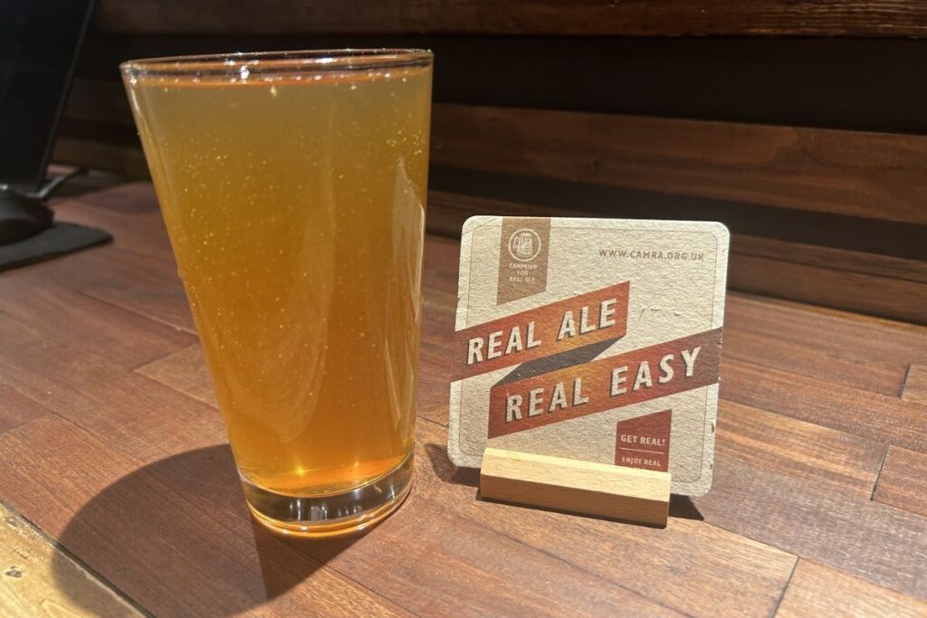 タップは1種類。のぼりべつ地ビール鬼伝説の「金鬼リアルエール」です。これを、札幌に2台しかないイギリス発祥の「ハンドポンプ」で注ぎます。一般的なビールサーバーは炭酸ガスが生ビールの樽の中のビールを押し出し、冷やされて注がれます。それに対し、ハンドポンプは井戸水のようにポンプでくみ上げて注ぎます。こうして注がれたものが「リアルエール」です。1パイント(473ミリリットル)1200円です。