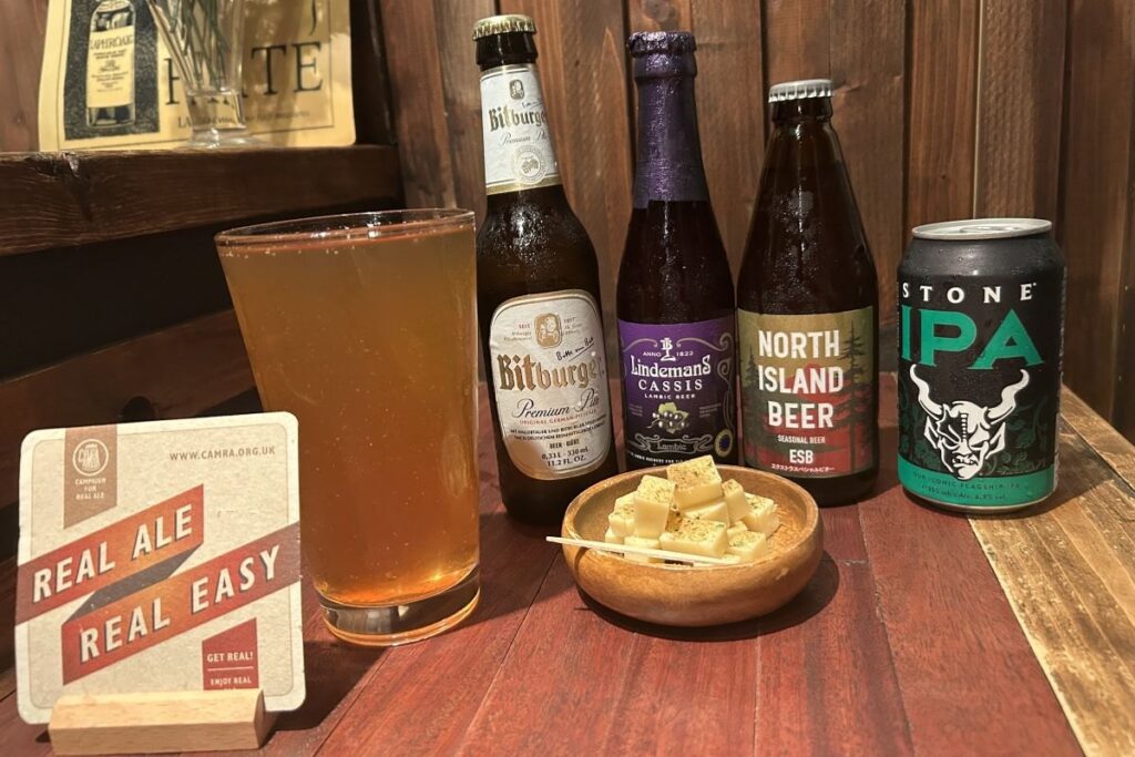 フードはサラミやナッツ、チーズなどのおつまみが中心。金鬼リアルエールと、「ゴーダチーズのセロリ塩かけ」をお願いしてみました。金鬼リアルエールは、泡がありません。炭酸ガスによって押し出された「ドラフトビール」に比べて、余計な炭酸が入っておらず、柔らかで芳醇な口当たりです。また、ドラフトビールは炭酸に押されて、氷で冷やされながらチューブの中を通って注がれるので、「キンキンに冷えたビール」と言われるほど冷え冷えですが、リアルエールは口に入った時に、少し冷たいかな、という程度。その代わり、ビールの味と香りがしっかりと感じられます。