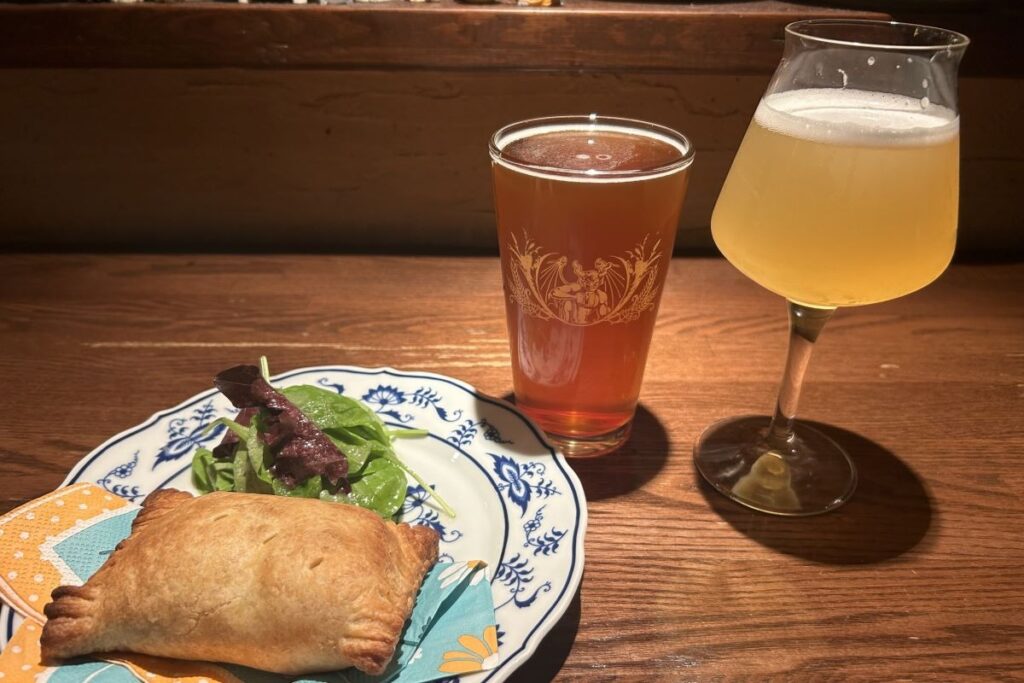 フードは10種類ほど。その中から店名を冠した「カラハナのミートパイ」(850円)を頼んでみます。きつね色に焼かれ、ふっくら膨らんだパイにナイフを入れると、サクッと音がします。中には小麦のビールとトマトソースで煮込み、ほろほろにほぐれた豚肩ロースがたっぷり。クミンなどのスパイスを効かせてあり、パイ皮のバターの香りとあいまって、ビールが進みます。具の入っていない端のパイ部分もサクサクとしていておいしい。