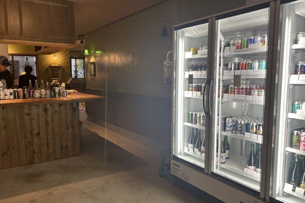 今年4月には、空いていた店の隣に国内外の缶やびんのクラフトビールを販売する「リカーズからはな」もオープンさせました。購入した缶やびんのビールや、テイクアウト販売している樽生を、酒屋の「角(かく)打ち」のように、奥のカウンターでスタンディングで飲むこともできます。