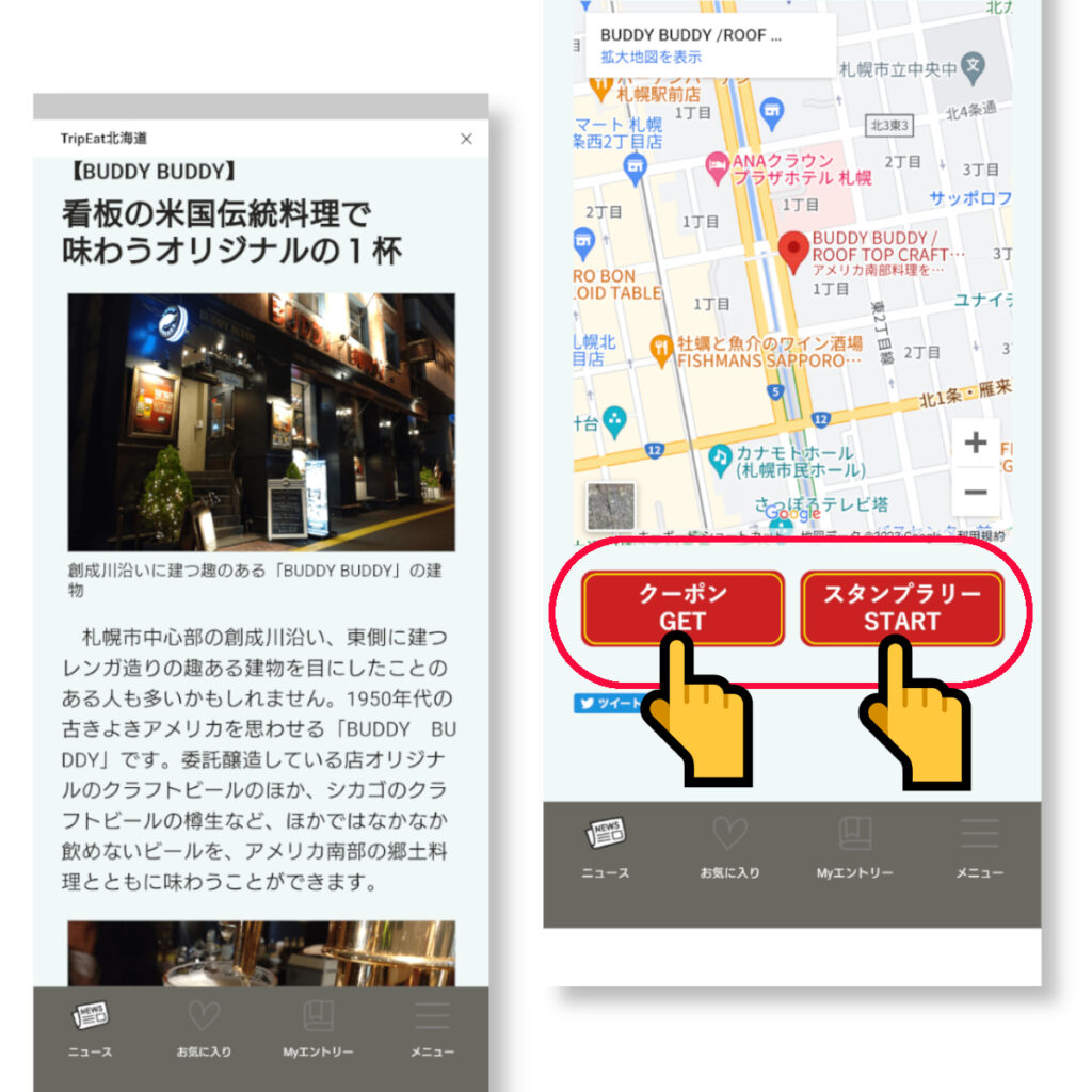 お店紹介の記事の末尾には「スタンプラリー」や「特典クーポン」へのリンクボタンも設置しています。お店をご利用の際には、こちらのリンクボタンからもラリーのスタンプや特典クーポンを獲得できますのでご活用ください。