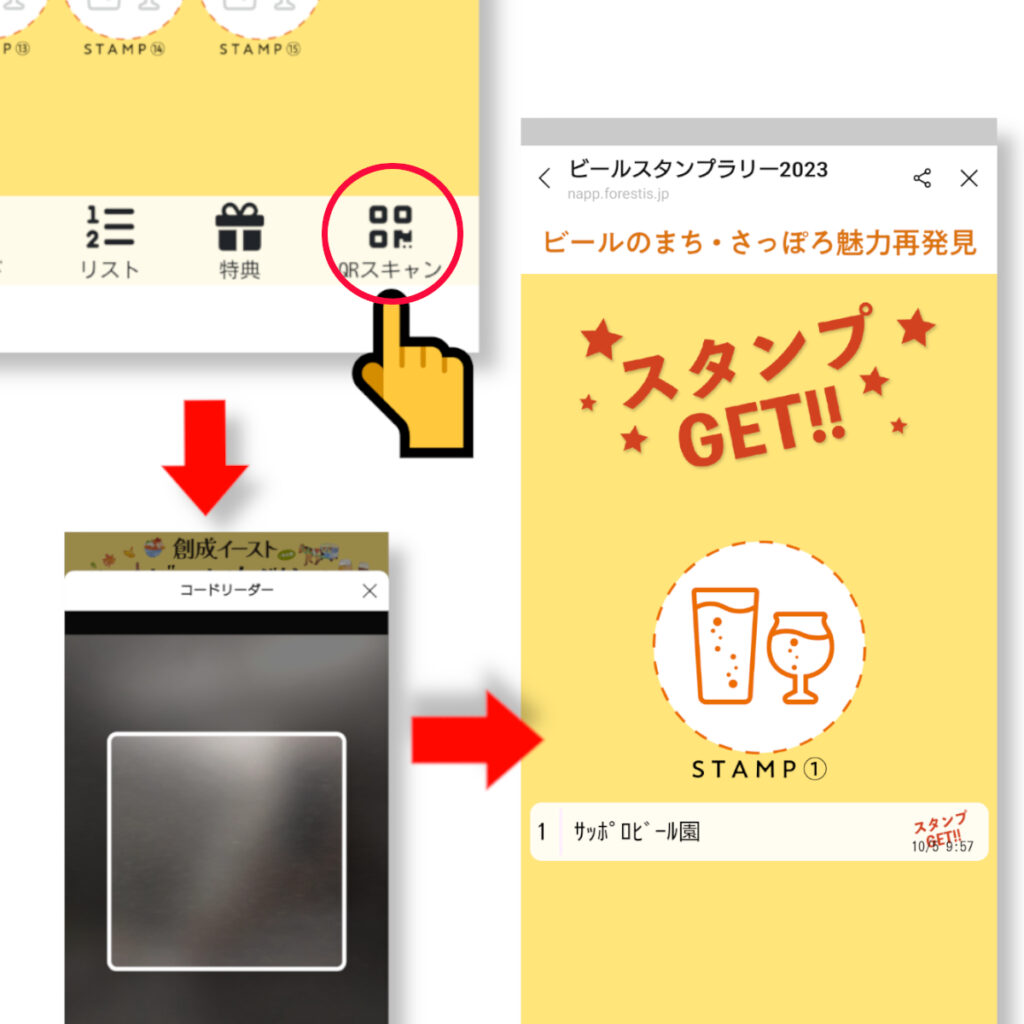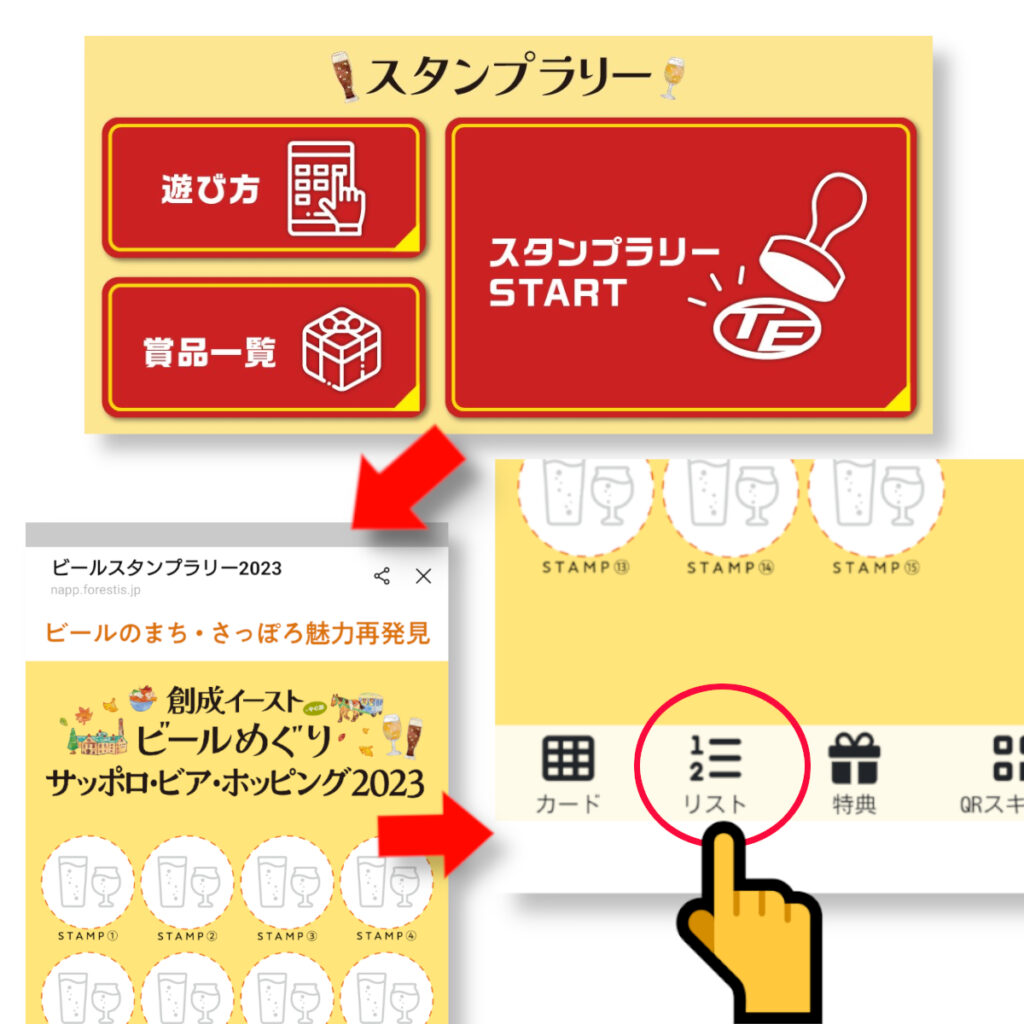 まずは左側の「遊び方」や「賞品一覧」をタップしてチェックを。「スタンプラリーSTART」をタップすると「スタンプカード」が表示され、下の「リスト」からスタンプラリー参加店が確認できます。参加店をご利用時に、画面下の「QRスキャン」のタップで起動するコードリーダーで、お店に置いてあるスタンプラリー専用のQRコードを読み込むと「デジタルスタンプ」を獲得できます。