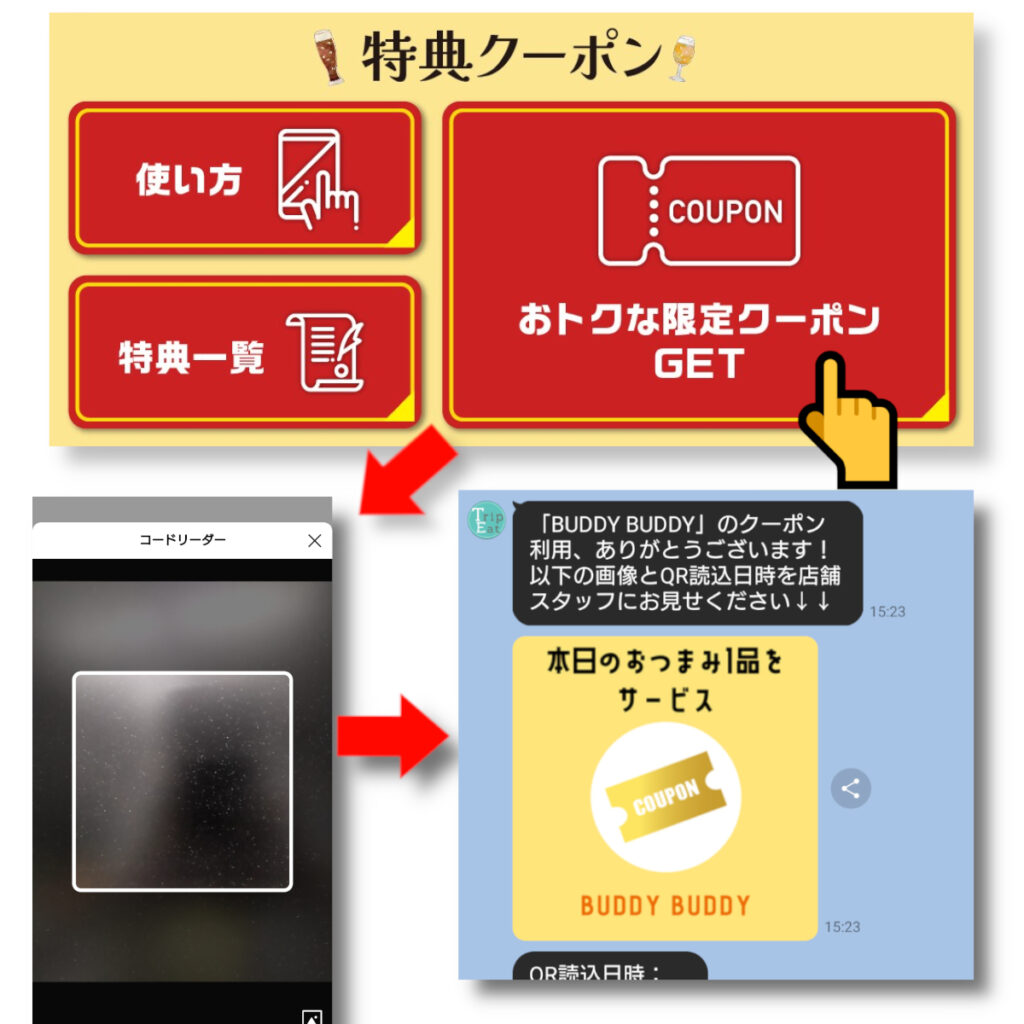 その2<おトクな友だち限定クーポン>参加店でおつまみなどをサービス