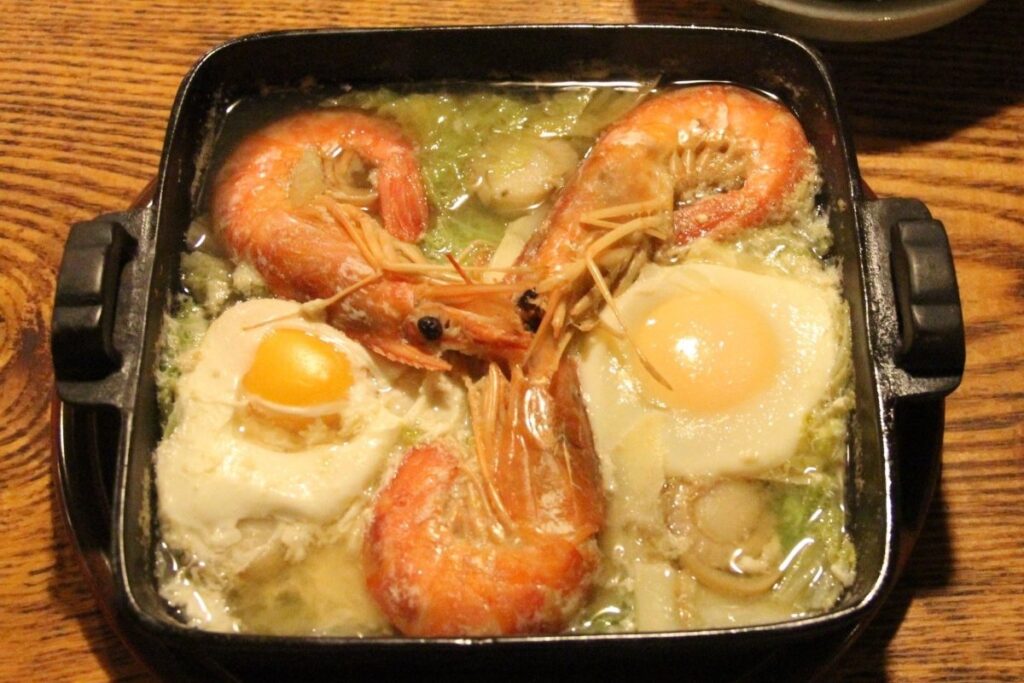一番人気は、創業時からの変わらぬ味であり、名物の「トロイカ鍋」。鶏と野菜を2日間煮込んだスープに、ホタテ、海老、白菜、タケノコが入っており、卵を混ぜてからいただきます。体に染みるような優しい甘さのスープを飲み干したころには、体はポカポカに。