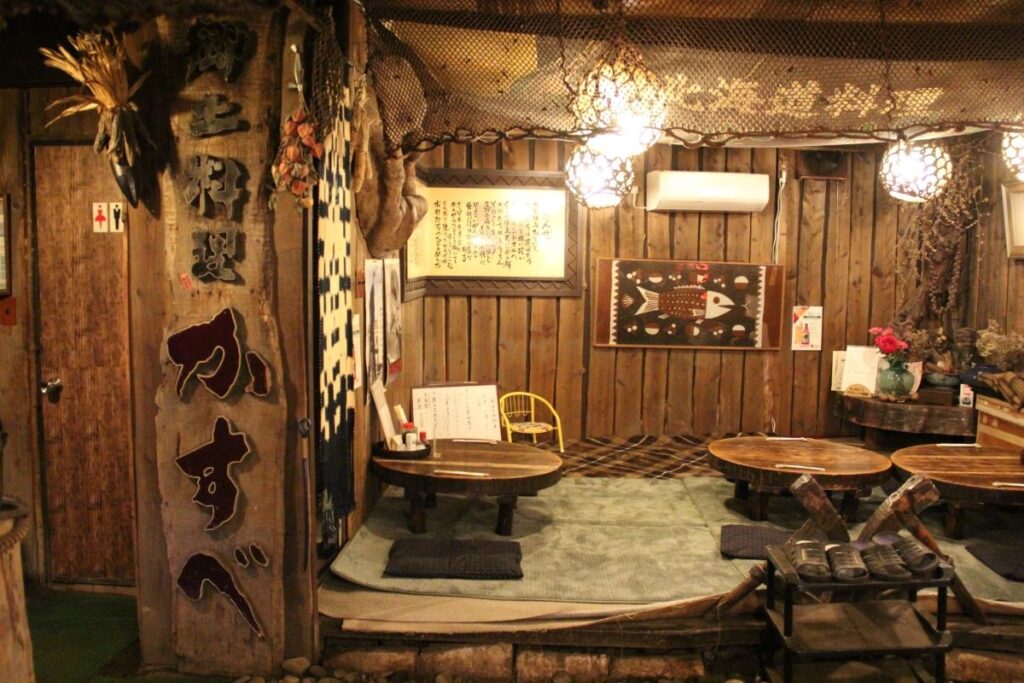 店内に足を踏み入れた途端、なんとも懐かしい気持ちにさせられるのが、創業53年の「北海道料理 かすべ」です。小樽を代表する魚・ハッカクや店名にもなっている魚・カスベが天井から吊るされていたり、薪ストーブや昔のニシン漁で使われていた道具のひとつ「モッコ」も置かれていたりと、料理を待っている時間も飽きません。