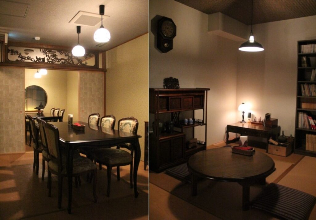 建物の入り口から2階に上がり店内に入ると、レトロかつ和洋折衷な雰囲気にうっとり。洋室の「文学の杜」や個室の和室「越治」、「魁陽」など、大正浪漫なインテリアが楽しめます。
