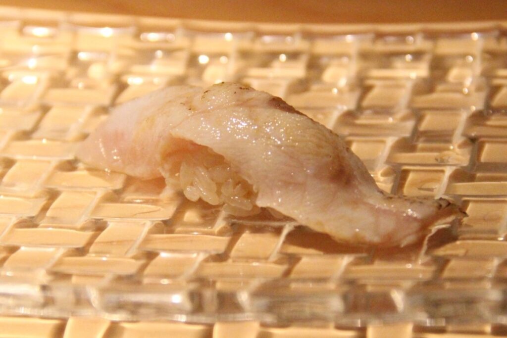 まずは酒の肴となるメニューを楽しみつつ、対面でじっくり鮨を味わってもらいたいそう。ちなみに、シャリは江戸前鮨で使う赤酢を使用。ほのかに紅く染まったシャリは小ぶりなので、女性や少食な方でも、最後の〆にちょうどいいサイズ感です。