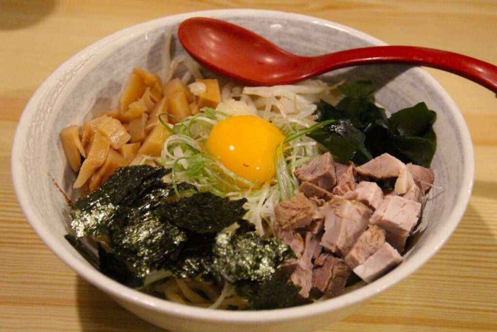 じつは、須河さんのお父さんは寿司職人、ご自身も和食で修業されていたこともあり、オススメは「刺身の3点盛」。そして、高架下の営業時から不動の一番人気というのが「油そば」で、醬油ベースのこってり系のタレがからみ、とくに若い男性に人気の一品です。また、ピリ辛の「台湾まぜそば」はタレも具材も違い、油そばよりはあっさり。どちらも特注の太麺を使用した食べ応えのあるメニューです。