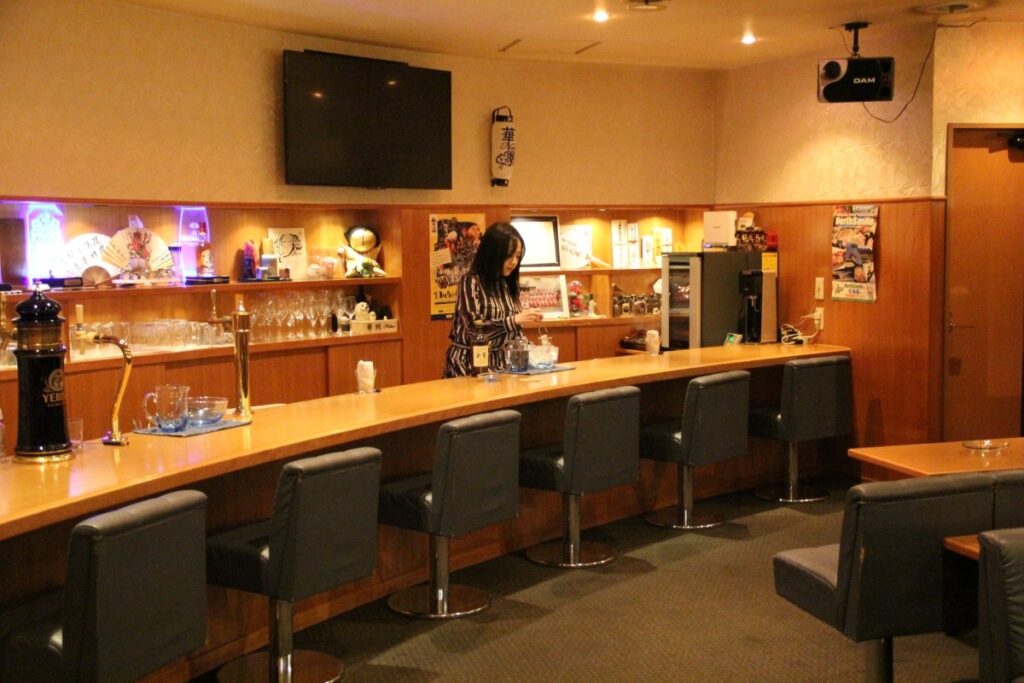 花園というと、ネオンの灯るスナック街を思い浮かべる方も多いでしょう。カウンターだけの小さなスナックもありますが、まもなく創業19年の「華婉(かえん)」は、比較的大きなスナックです。常時、ママの髙田 寧子さんと女性スタッフ数名が接客を担当し、広々とした店内では会社の二次会など、大人数でも使用可能です。