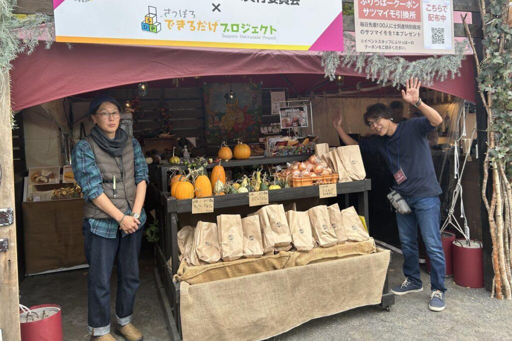 会場では、「さっぽろできるだけプロジェクト」と題し、札幌近郊でとれた野菜も販売しています。新十津川村産のサツマイモ紅あずまのほか、石狩市産のダイコンやニンジン、岩見沢市産キュウリなど、新鮮な地場産野菜が並びます。フリーペーパーの「ふりっぱー」に付いているクーポンを持参すると、毎日先着100人に、道産のサツマイモを無料配布しています。