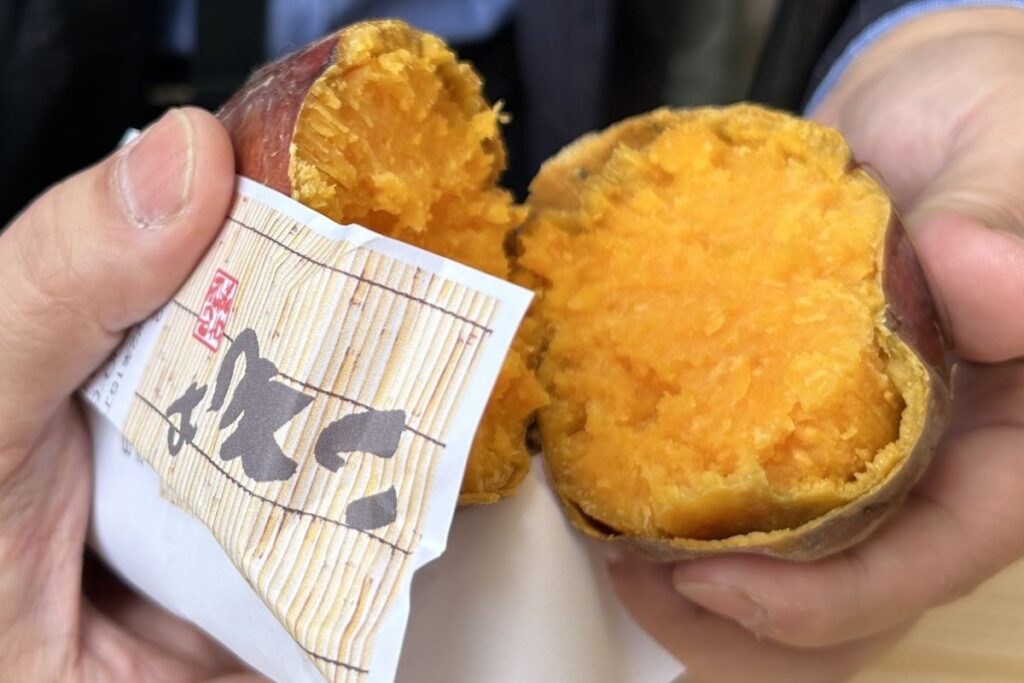 さっそく、焼きいもの食べ比べをしてみましょう。「おいも屋いも平」(札幌市清田区北野)は、全国各地から厳選したサツマイモを熟成させて使用。糖度45度以上の「いも平スペシャル」(1本700円、ハーフ400円)は、金色で見るからにみつがたっぷり入っているのが分かります。粘度が高く、ねっとりとしており、水あめをなめているかのような甘さ。1日置くと、さらにみつが出てくるそうです。