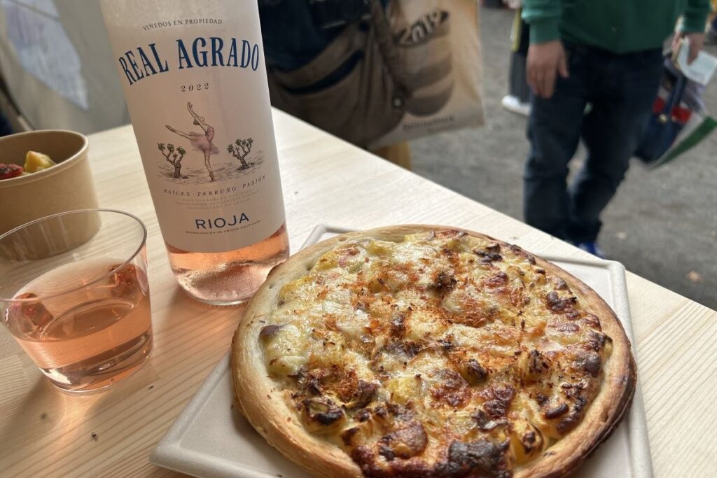 同店では、サツマイモを使ったおつまみも3種類、提供。「鮭トバとさつま芋と北海道チーズ2種のピザ」(1400円)は、鮭トバとサツマイモが入ったたっぷりのホワイトソースがのっています。ロゼワインは、ドライでどっしりめの飲み口です。おつまみはほかに、蝦夷鹿ソーセージとさつま芋と北海道チーズの包み焼きパイ(700円)と北海道5工房のチーズとさつま芋ポテチの盛りあわせ(1000円)がありました。
