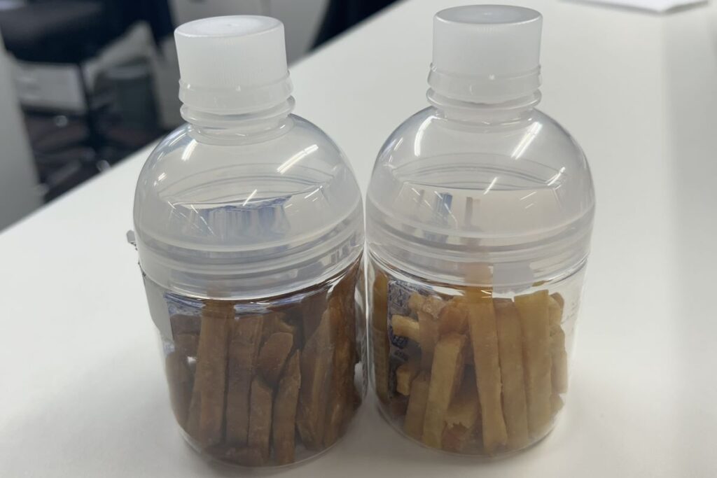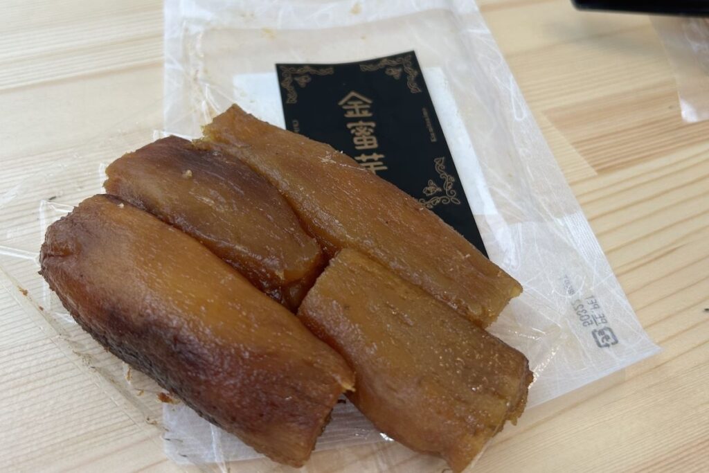 焼きいもや(札幌市西区発寒)は、シルクスイート、ハロウィンスイート、パープルスイートの「3種食べ比べBOX」(500円)があっという間に売り切れ。茨城県産紅はるかの干しいも(200グラム、850円)を食べてみます。先ほどのいも平にあった金蜜干し芋ほどではありませんが、袋にくっついて開けるのが大変です。薄くスライスされた干しいもは、かむごとにサツマイモの素朴な味わいが広がります。