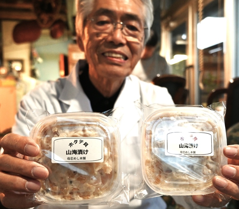 室蘭港エンルムマリーナのセンターハウス内の弁当店「母恋めし本舗」(絵鞆町)は、中国の日本産水産物の禁輸措置で痛手を受けるホタテを支援しようと、オホーツク産を使った山海漬けを開発、同時に元々メインの食材として活用していた胆振産ホッキ貝の山海漬けも新たに作り、二つを10月に同本舗などで発売した。関根勝治代表(84)は「二つ合わせて贈呈品としても売り込みたい」と話す。