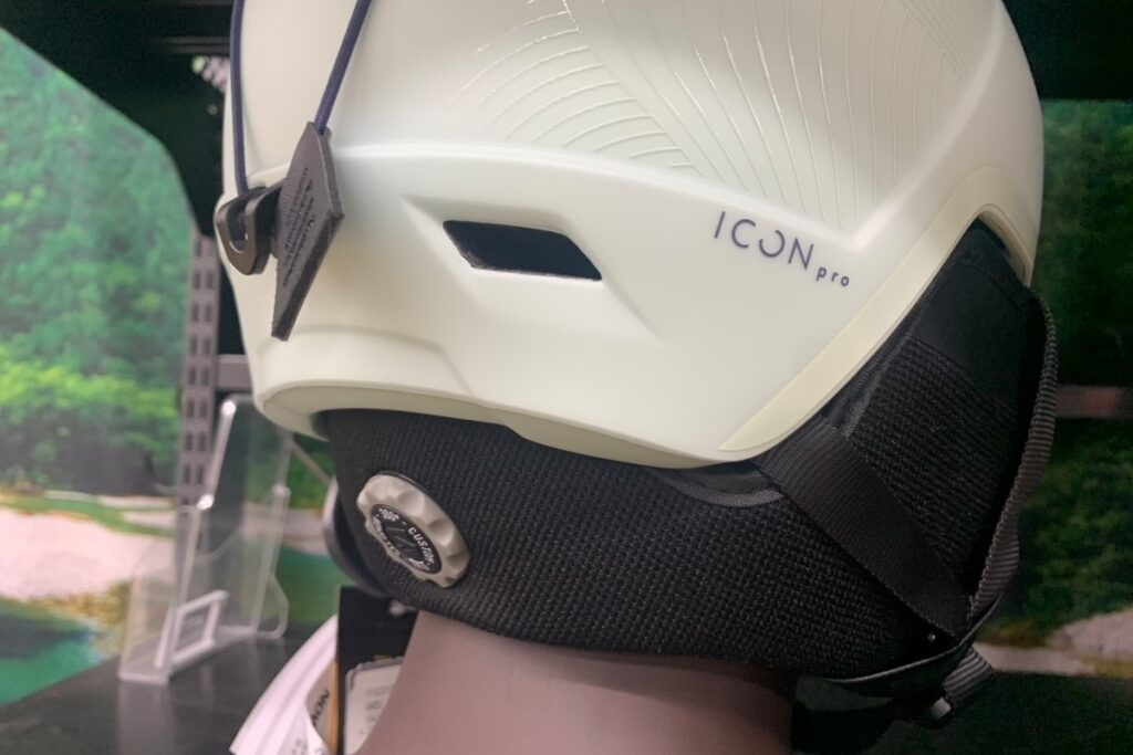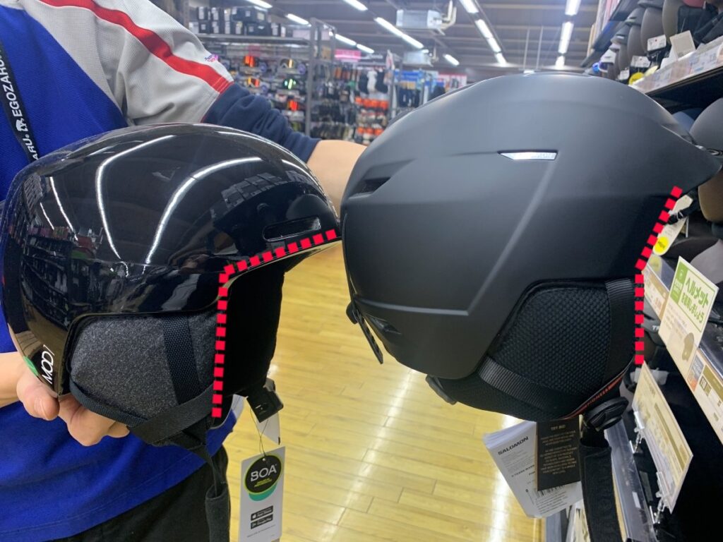 そのサロモン製ヘルメットの特徴の1つが、耳当て部分の形状。他社と比較してほおの前方向に広がっており、「小顔」効果があるとか。他社製と比べると若干ですが、耳当てがヘルメット前方に向いています。見た目も大事です。