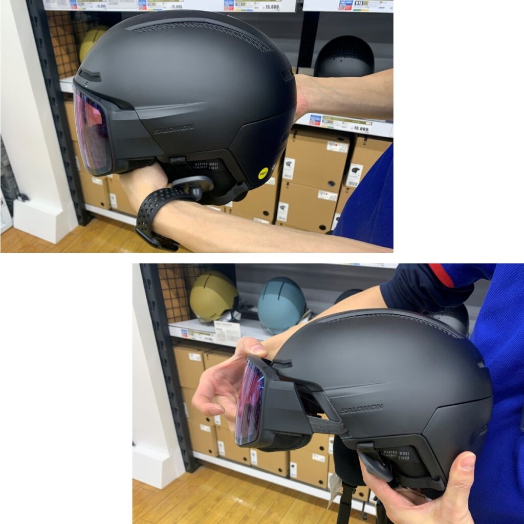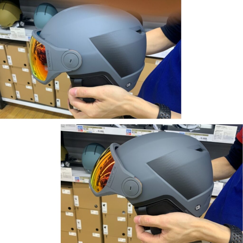 このゴーグル付きヘルメットの中には、ゴーグルの位置を上下だけではなく、前後にも調整できるものもありました。値段は少し高めになりますが、実際に被ってみると、ゴーグル部分と顔の距離を好みの位置に調整することで、顔面にフィットさせることができます。