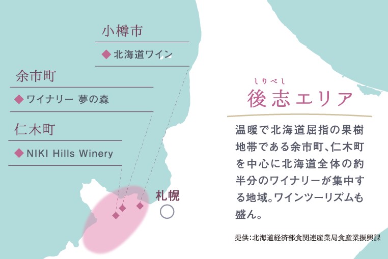 温暖な気候に恵まれた後志エリアは、果樹園栽培が盛んな余市町や仁木町を中心に道内53あるワイナリーの約半数が集中している。さらなる新規参入も見込まれる中、個性豊かな新旧ワイナリーが、良きライバルとして切磋琢磨(せっさたくま)しながら、より魅力的なワイン造りに心血を注いでいる。
