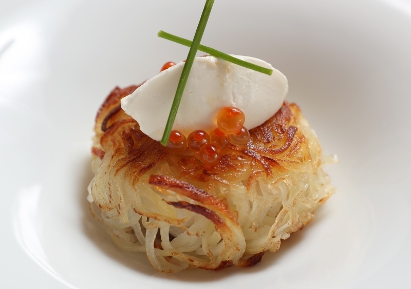 ◇材料(2人分) マダラの切り身120グラム、ジャガイモ(メークイン)180グラム、サワークリーム20グラム、バター40グラム、サラダ油大さじ2、万能ネギ、塩、コショウ各適量、イクラ少々