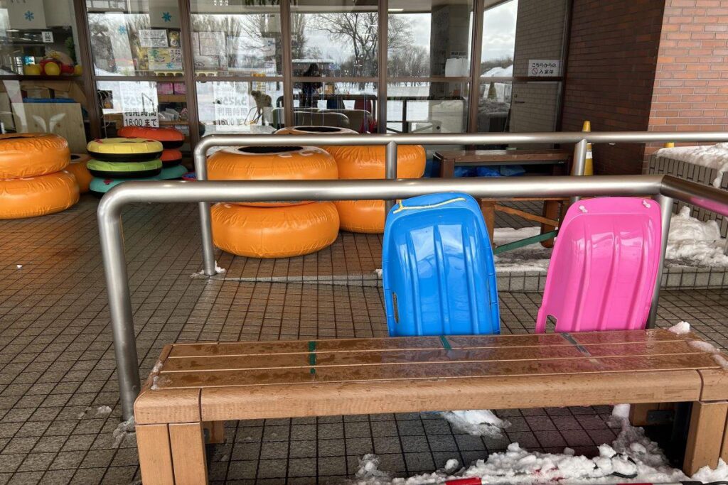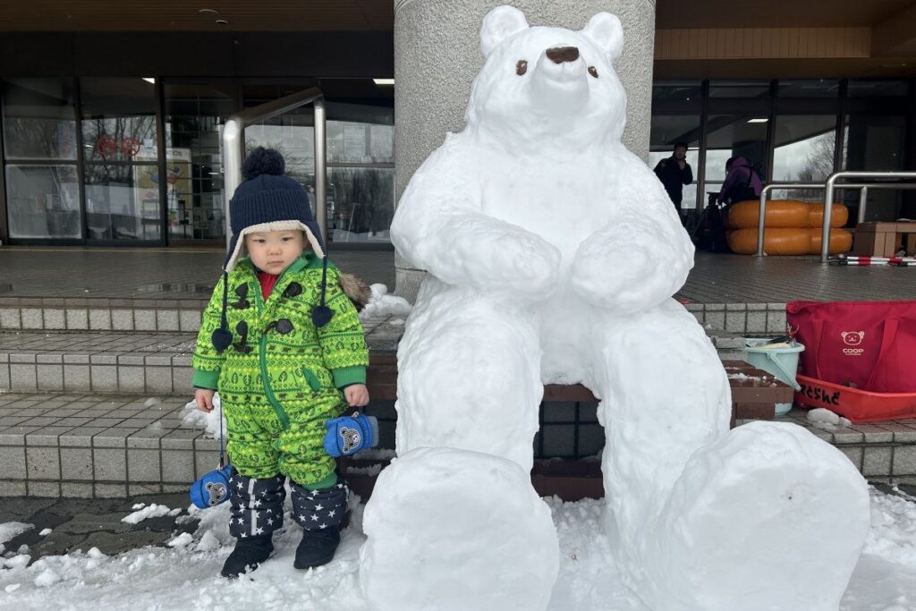 会場では、無料でそりやチューブなどを貸し出しており、会場横の「ときの広場」で滑って遊ぶことができます。スタッフ手作りのかわいいクマの雪像もありました。土、日、祝日には、バナナボートや馬そり(各大人400円、子ども200円)、トラクター遊覧(大人200円、子ども100円)などもあります。