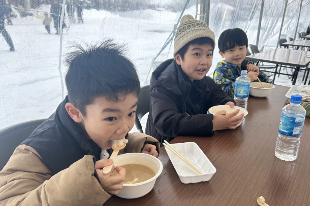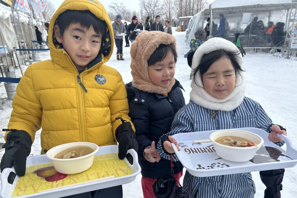 このイベントには、札幌保健医療大、天使大、北海道文教大、藤女子大の4大学が協力し、学生たちが北海道の郷土料理や地場食材をもとに、メニューを考案しました。会場には家族連れらが訪れ、各地のご当地鍋料理を味わっていました。食事用のストーブ付きテントもあるので、多少の降雪でも安心です。