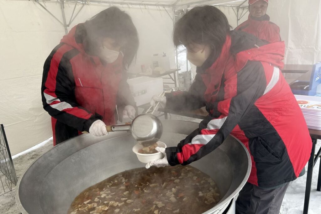 鍋料理は石狩鍋(石狩)のほか、てっぽう汁(根室)、いもだんご鍋(全道各地)、がんがん鍋(赤平)、スープカレー鍋(札幌)の5種類。直径90センチの大鍋で、具材を煮込んで作ります。すべて1杯500円。平日は各鍋先着20人は1杯100円です。1杯100円でご飯も販売しています。平日は各鍋100食、土、日曜は各200食を提供します。
