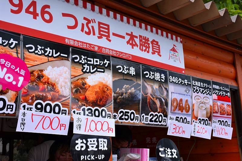 釧路から出店している「炉ばた居酒屋 釧路はたご家」と「つぶ貝と旅するクシロバコ」の連合ブース「946つぶ貝一本勝負」は、つぶカレーなどツブ料理が本日、大幅値下げされていました。「釧路の美味しい食材なので、ぜひ皆さんに食べてもらいたい」と決断したとのこと。