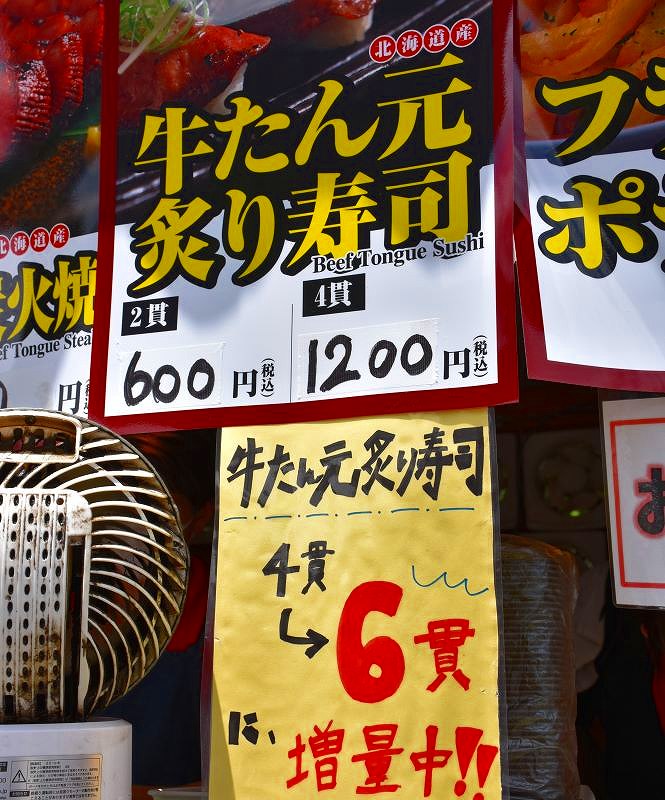 「牛たん・もつ 鈴の屋」(札幌)の、たん元炙り寿司(1200円)の「ただいま増量中」も継続中でした。