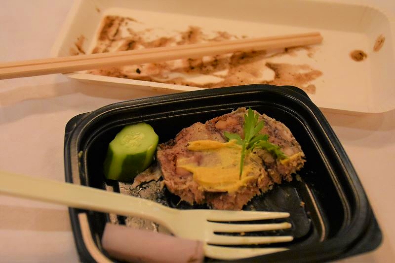 午後2時半を過ぎ、会場はかなりゆったりしてきました。どのブースもほとんど並ばずにすぐ買えるようになっています。編集長の山崎も薫製工房ハントヴェルク(南幌町)の「北海道産豚肉の鉄板焼きロングウインナー」(1本300円)と、小樽のイタリアンオステリア・イル・ぴあっと・ヌォーボ」の「余市北島麦豚のパテドカンパーニュ ピクルス添え」(450円)を購入。山﨑ワイナリー(三笠市)のワインと共に堪能しました。写真を撮るのを失念する美味しさでした。