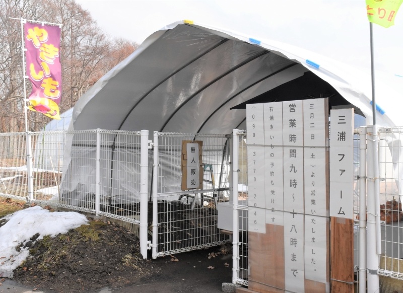 焼き芋は繁春さんの好物。数年前まで近所に移動販売車が来ていたが、最近は見かけなくなったため、自ら焼いて販売しようと思い立った。「今までお世話になってきた地域のみなさんに何か恩返しを」と、道道沿いのファーム入り口にテントを建て、2日から無人販売を始めた。びらとり農協は「焼き芋の無人販売は聞いたことがない」としている。