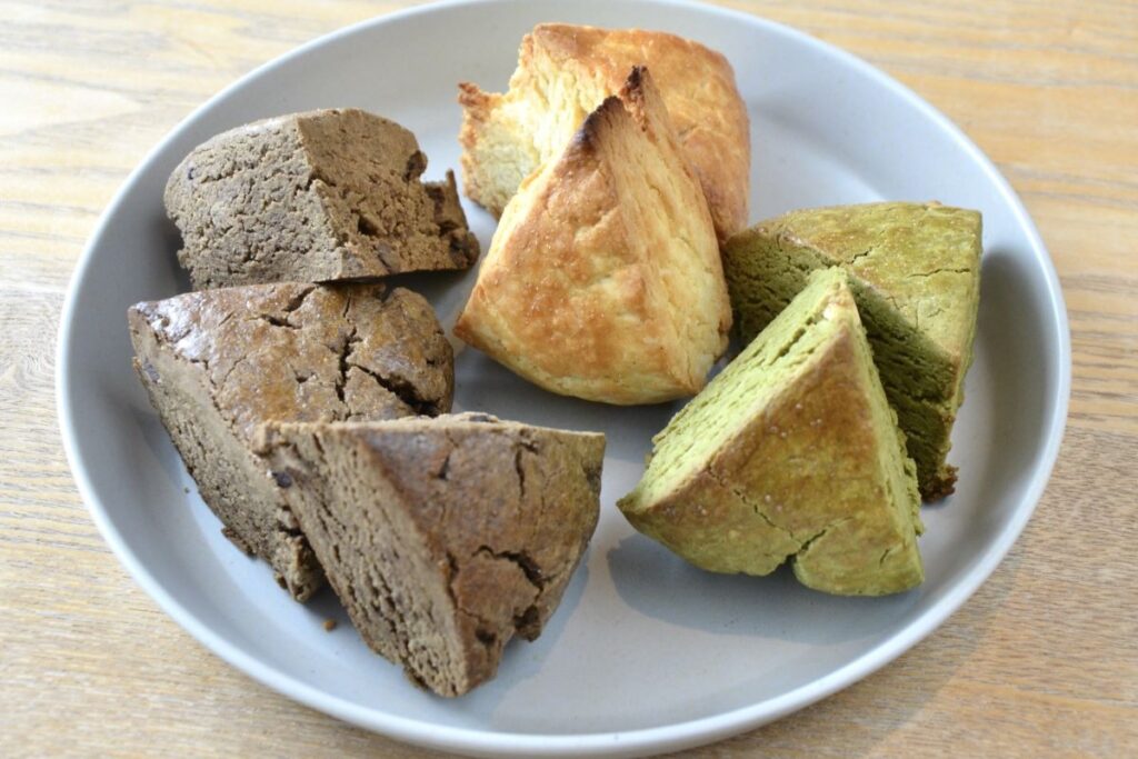 この食感を出すために選んだのが、美唄市の農家が栽培、製粉を手掛ける「ゆめぴりか」の米粉。粒子が細かく、お菓子作りに向いているそう。栄養価の高い玄米粉を使ったスコーンは、かむほどに滋味深く、米粉とは違う風味を楽しめます。